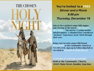 Everyone is invited to this special evening with Dinner and a Movie. Join us for Soup/Chili potluck meal following by the viewing of The Chosen – Holy Night. Please RSVP by signing up at the church, calling 715-385-2146 or email [email protected]