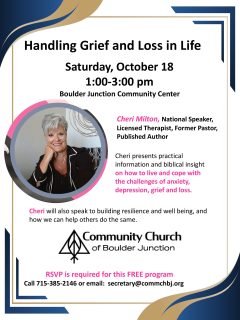 The Community Church of Boulder Junction invites you to the presentation, Handling Grief and Loss in Life, on Saturday, October 18 from 1pm-3pm at the Boulder Junction Community Center, 5392 Park Street.